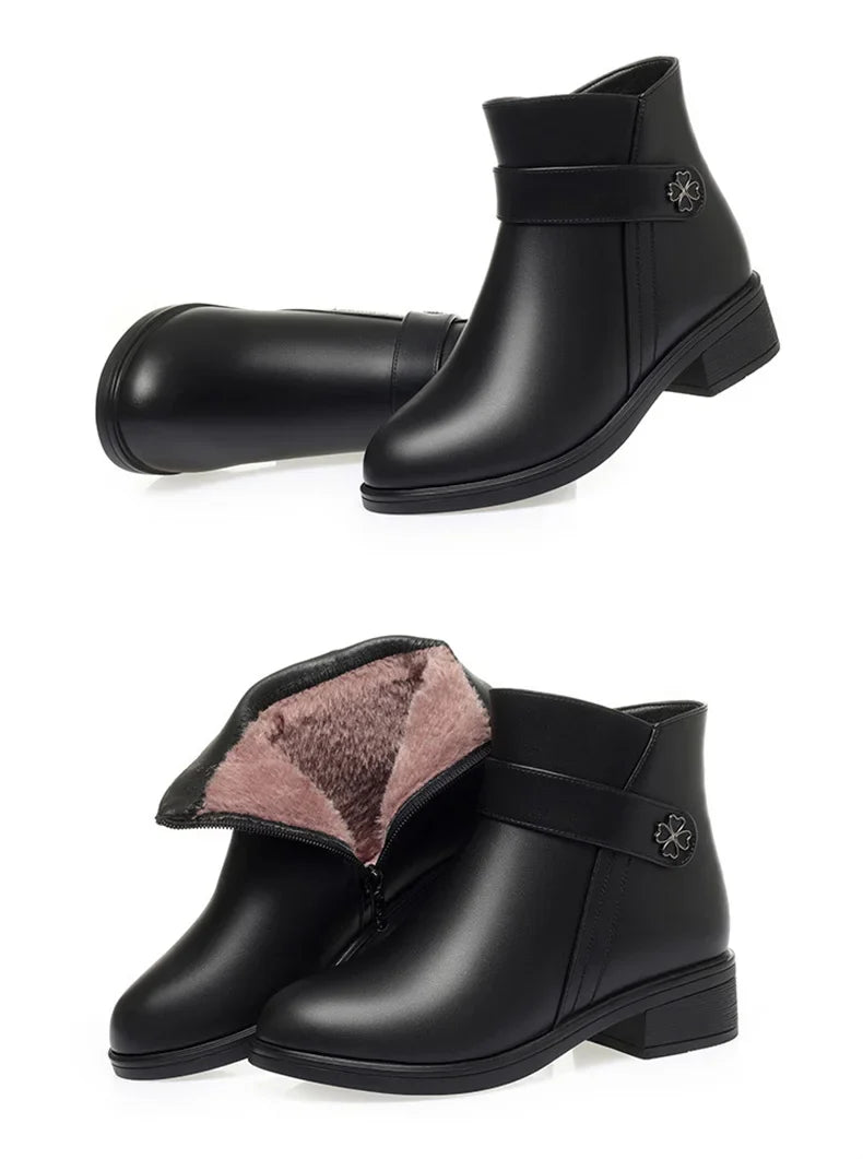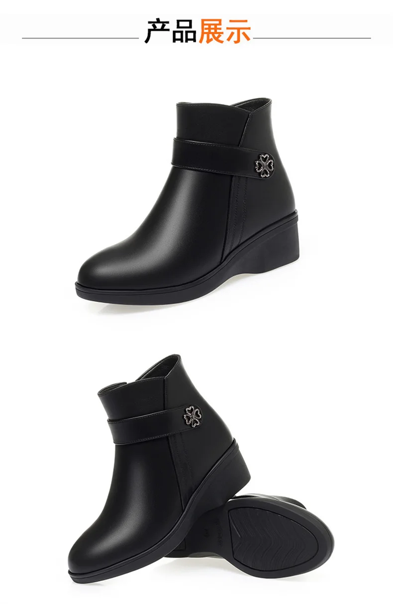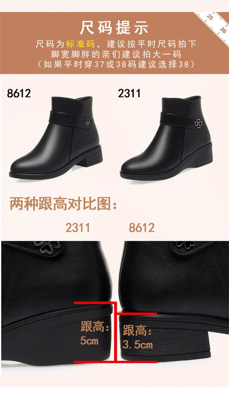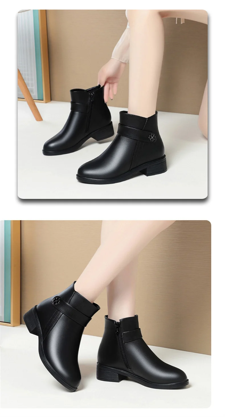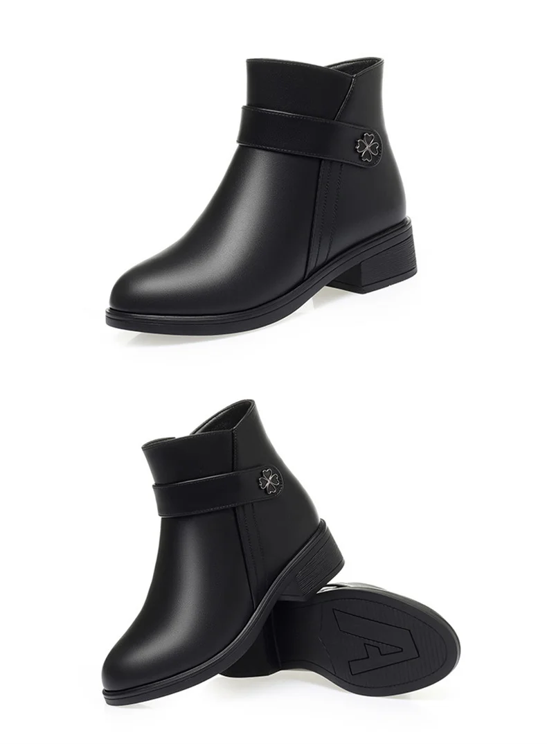 Autumn Winter New High-heeled Short Boots Pure Black Pointed Toe Leather Boots Wedges Concise Metal Decoration Lucky Symbol